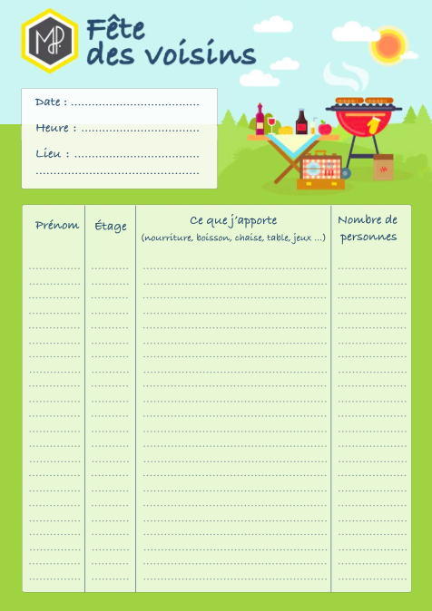 La Fête des voisins est une fête collégiale : rassemblez autour de vous plusieurs voisins motivés pour l’organiser à plusieurs, c’est l’assurance d’une fête réussie ! Vous pouvez également accrocher une liste dans le hall pour que chaque voisin note ce qu’il apporte. N’hésitez pas à utiliser la nôtre :